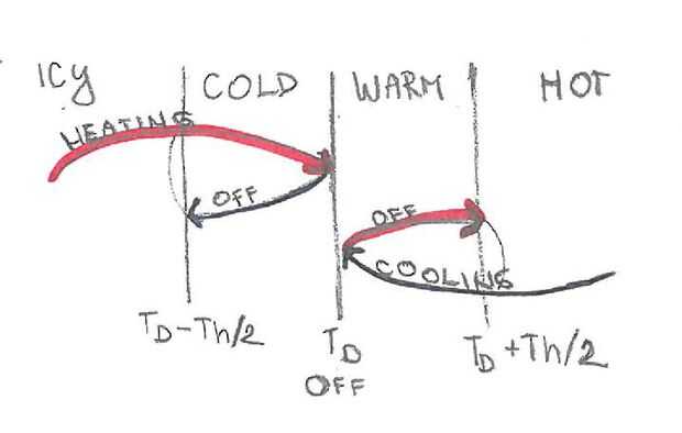 -decidir entre calefacción, refrigeración y apagado. Se incluyeron histéresis de temperatura para evitar la conmutación entre dos Estados que a menudo, cuando estamos cerca de la temperatura deseada.