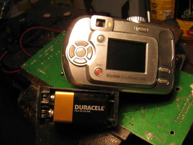 Cualquier momento se toma una cámara aparte, es muy probable que el condensador está cargado y esperando que te choque. Las cámaras contienen un condensador de alto voltaje para encender el flash de las cámaras. Este condensador puede recargarse - alrededor de 330 en la cámara estaba usando - incluso cuando las baterías no están en la cámara. Para descargar el flash los cables del condensador puede ser cuidadosamente en corto hacia fuera. Dudo que un choque de esto sería normalmente hace daño a nadie, pero le dará una sorpresa bastante desagradable. No es nada tan grave como condensadores de microondas, pero ten cuidado! No soy responsable, en todo caso por cualquier daño este proyecto podría provocar. También, tratando este proyecto riesgos arruinando su cámara y posiblemente una garantía. Es por eso que utiliza una cámara de $2 dólares que recogí en una tienda de segunda mano en los Estados! Yo no soy responsable de ninguna manera lo que podría pasar a la cámara. Proceder con precaución.