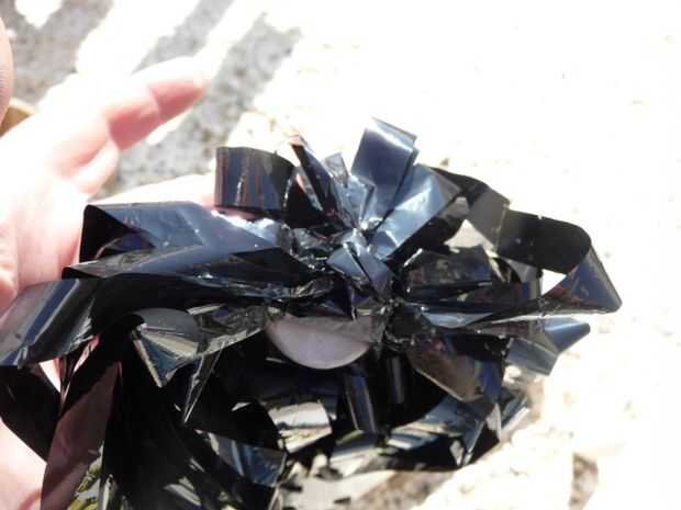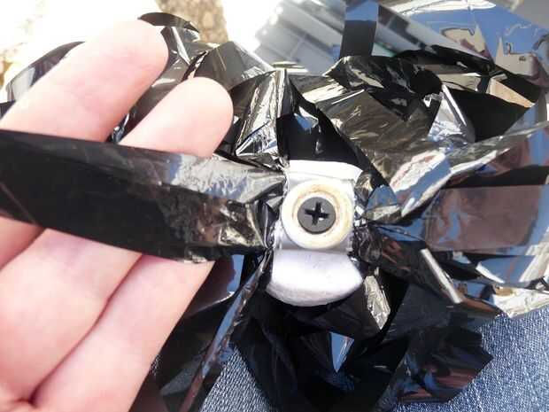 Recoger 4 hebras de cinta de cassette de ambos lados enfrente de la cabeza del tornillo. Ate las hebras (8 total) en un nudo cuadrado. Esto evitará que los filamentos de pom pom separándose y dividiéndose por la mitad. Ver la 3 º foto para una revista ilustrada mejor detallada. ;-)