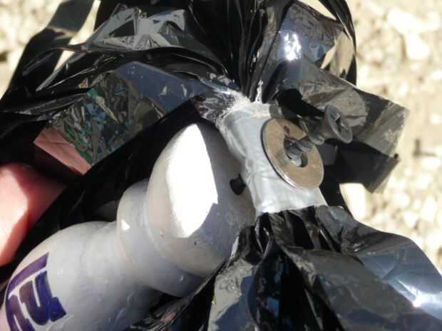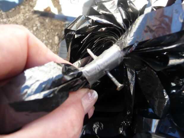 Extraiga el clavo. Coloque la arandela sobre el agujero del punto encima de la cinta del conducto y manualmente gire el tornillo a través de la lavadora y por el otro lado.