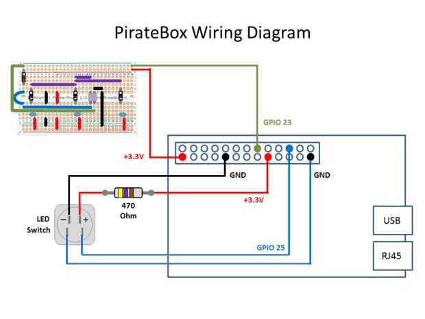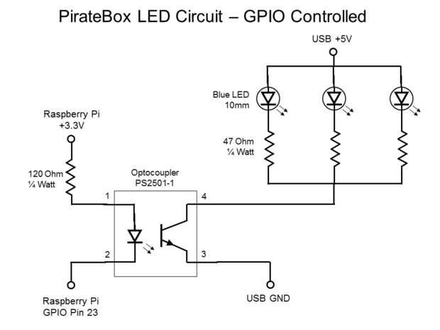 El "diagrama de cableado de PirateBox" muestra cómo los diversos componentes están conectados a la frambuesa Pi. El segundo diagrama y el esquema muestran el cableado de la tarjeta de circuitos del LED. Ya los tres LEDs gran más poder del que puede proporcionar el Raspberry Pi, el LED funciona por separado y utiliza un optoisolator para mantener el LED del circuito aislado de la Raspberry Pi.