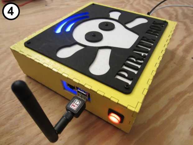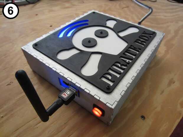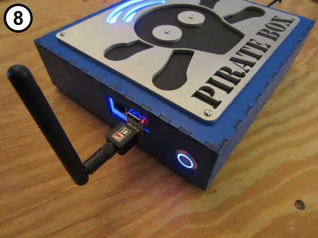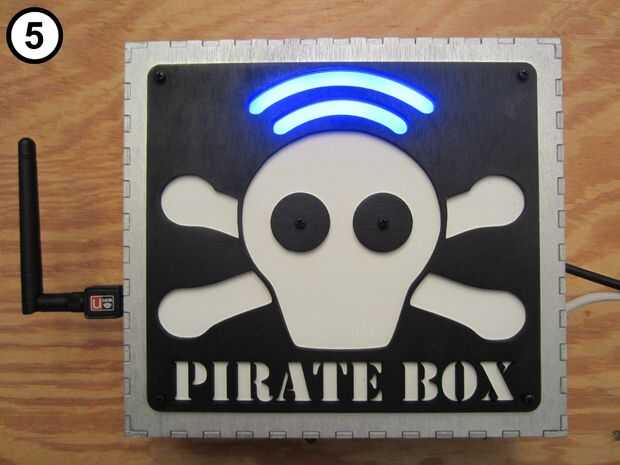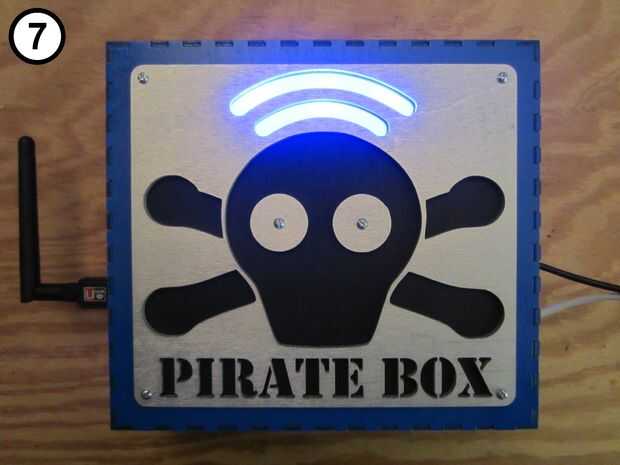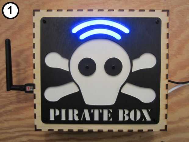 La PirateBox puede hacerse con una gran variedad de pieles. Fotos 1 y 2 muestran el caso de la madera natural sin pintar. Fotos 3 y 4 utilizan un esquema de color amarillo. Fotos 5 y 6 utilizan una pintura de aerosol de plata metálica: pintura metálica de plata está combinado con la textura natural de la madera, el caso parece está hecho de aluminio cepillado. Fotos 7, 8 y 9 muestran un esquema de color azul con una calavera negra y un botón metálico de 16mm con anillo de LED azul (Adafruit ID 481).