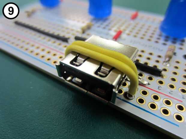 - El conector USB es sostenido en lugar por soldadura cuatro conexiones y necesidades de apoyo adicional para garantizar no interrumpir si el cable es tirado. Reforzar el conector de corte y desforrado dos trocitos de alambre como se muestra en la foto 4. Poner los cables en el conector USB y en lugar de la soldadura como se muestra en las fotos 5 a 9. Recorte los extremos de los cables en la parte inferior de la placa de circuito. Asegúrese de que los cables se colocan paralelos como se muestra en la figura 8. Si los cables se colocan de esta manera, la voluntad no tiene ningún efecto sobre los sistemas electrónicos.