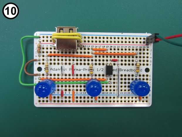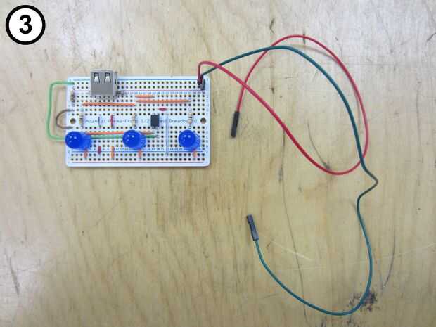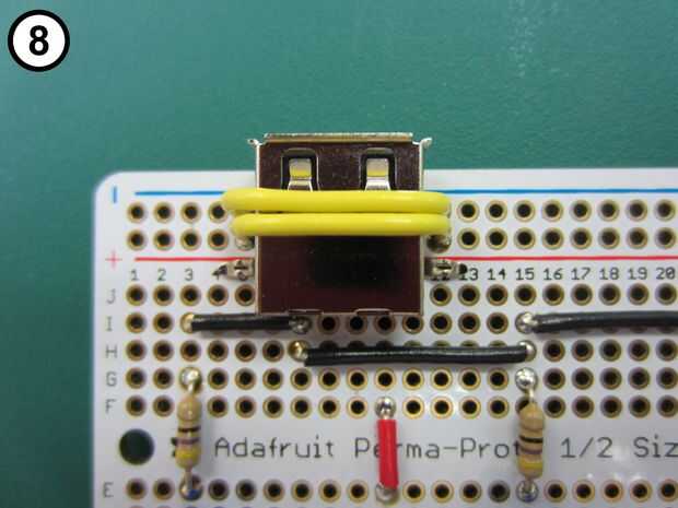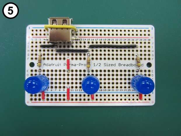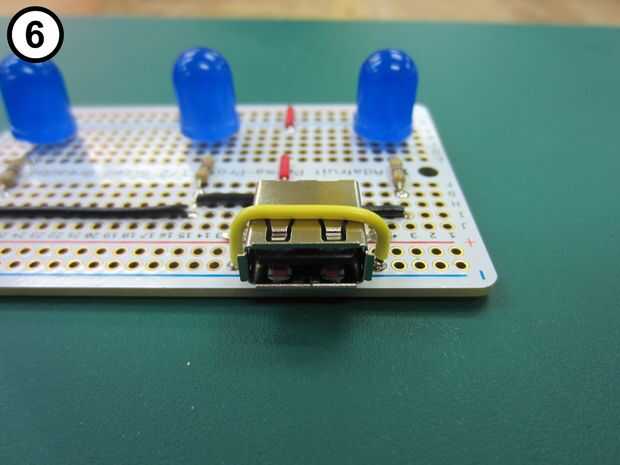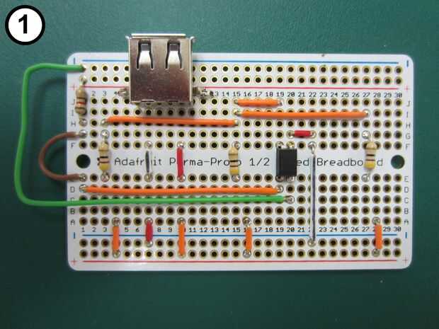 - Usando el diagrama como guía, soldar todos los componentes a la placa de circuito. La soldadura de las piezas en este orden: (1) cables, (2) resistores, (3) optoisolator, LEDs (4) y (5) del conector USB. Asegúrese de que soldar el optoisolator exactamente como se indica con los números en el diagrama (habrá un pequeño punto en el chip por el pin 1). También asegúrese de que soldar los LED con la polaridad correcta como se muestra en el "+" en los LEDs en el diagrama. El cable más largo que sale de lo LED es el cable positivo (+). Después de soldar todos los componentes, cortar los cables en la parte inferior de la placa de circuito. El circuito final se muestra en la foto 1.