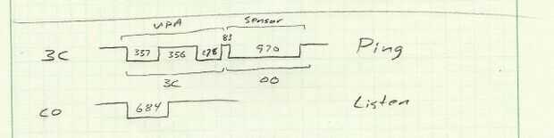 Echa un vistazo en la trama de osciloscopio a continuación. Es bueno me bajé mi duffs y hasta mi alcance. El alcance hace posible distinguir entre el micro y el sensor en términos de que está hablando activamente sobre el autobús. La trama de ámbito muestra un comando ping envío y respuesta inmediata del sensor. La distinción puede hacer basada en el nivel de voltaje en un nivel bajo en el bus. La UPA tira el autobús a un nivel de tensión inferior que hace el sensor. Bien, ese descubrimiento que vino práctico!