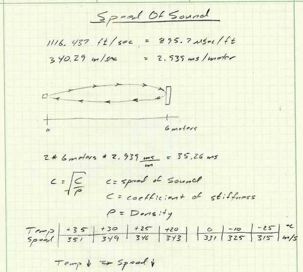 Hice algunas notas de la página de Wikipedia que tenían que ver con la velocidad del sonido. El hecho notable es que el sonido tarda aproximadamente 900us (microsegundos) a un pie de viaje. Se trata de aire seco a presión estándar (nivel del mar) y temperatura estándar (25 grados C). Como la temperatura desciende la velocidad del sonido disminuye demasiado. Esto significa tiempo para viajar que sube un pie. Si la temperatura se reduce a-25 grados C tendrá un extra 72 microsegundos para el sonido cubrir ese mismo pie! Impactante, yo sé.
