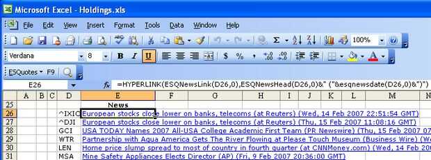 En la celda E26, introduzca =HYPERLINK(ESQNewsLink(D26,0),ESQNewsHead(D26,0) & "(" & esqnewsdate(D26,0) & ")")