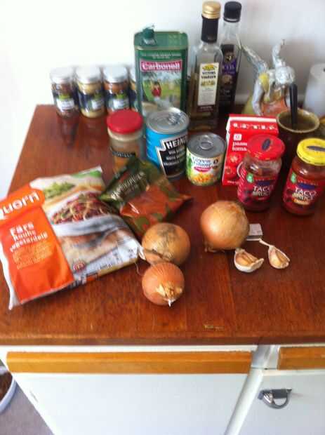 600 gr Quorn - o carne o sólo vegetales... ¿tal vez podrían trabajar peces? Cebolla, ajo, maíz, cocido al horno frijoles, pimiento en polvo y todo lo demás que usted necesita para hacer un relleno. Programar el horno para calor medio. Yo uso 220' C.