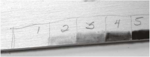 La mejor manera que he encontrado para identificar sus rangos y control durante la quema es mediante la creación de una franja de valor. Siempre que sea posible utilice una tira pequeña de madera de desecho que es del mismo tipo que la madera que se quema. Ahora tomando un borde, dividir la tira (con un lápiz) en secciones de 5 cuadrados pequeños (no más de 1 cm x 1 cm o pulgadas 25 x.25). IMPORTANTE: Hacer estas secciones pequeño, muy pequeño, hay una razón importante para esto. También asegúrese de que estén en el borde mismo de la madera de desecho para que toquen el borde con las muestras de valor diferente.