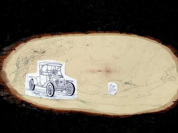 Para esta imagen utilizo un tilo corteza en óvalo. Coloque el patrón y luego proceder a lápiz en apoyo de información usando los patrones existentes de grano. Esta historia sería el equivalente de una novela que te lleva a otro tiempo y lugar. El modelo T es ahora parte de un arrebatador drama, una historia de interés humano. Esto puede vincular al espectador con sus propios recuerdos o los que han oído hablar de los padres o abuelos. La orientación horizontal indica una inmensidad y también da una calidad suave al trabajo. Este tipo de imagen que permite al espectador que serpentean y se convierten en una parte de la historia.