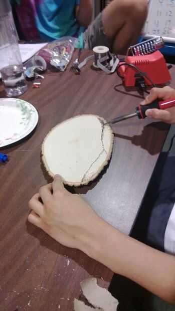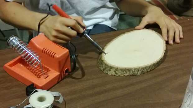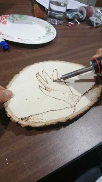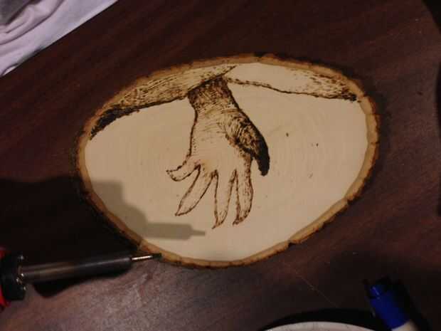 Utilizar el soldador para aplicar su diseño terrorífico en capas. Recomiendo usar niveles diferentes de calor para diferentes tipos de técnicas de aplicación. Use temperatura alta para líneas profundas oscuras y temperatura baja para bocetos más ligeros. Generalmente leña requiere más potencia de soldadura.