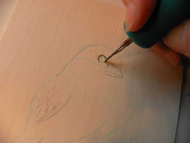 -La pluma debe ser perpendicular a la madera y parece una aguja de máquina de coser durante este proceso. No se debe mover la pluma en la superficie de la madera.