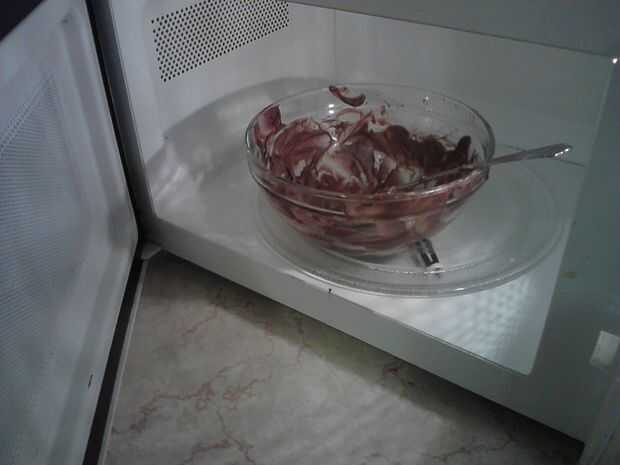 Microondas en alto por 40 segundos. Revolver hasta que todo se haya derretido. (si es necesario, coloque en el microondas durante 20 segundos adicionales)