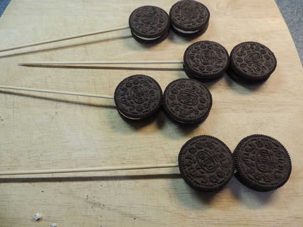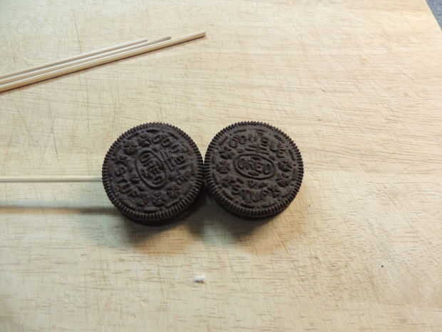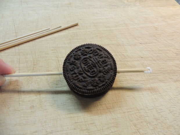 • Tomar un Oreo y deslice lentamente hacia abajo una brocheta dejando aproximadamente 1 pulgada de la varilla sobresale de. Necesita aplicar una pequeña cantidad de presión a las galletas mientras que deslizarlas sobre. Si no, las cookies suelen pop por la mitad.