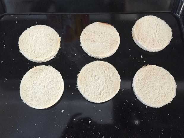 Untar las rebanadas de pan en la bandeja y cortar una forma circular con el cortador de galletas. Removemos el pan que sobra los círculos.