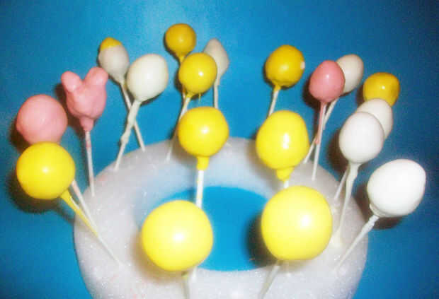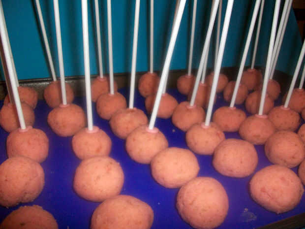 No preparar os palitos, ligeiramente mergulhe-os doce derretido antes de colocar metade ou diplomas de 3/4 na bola de bolo.