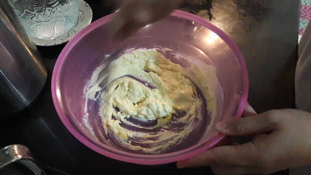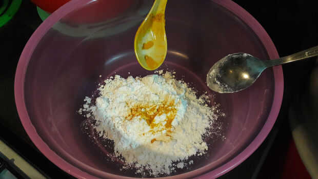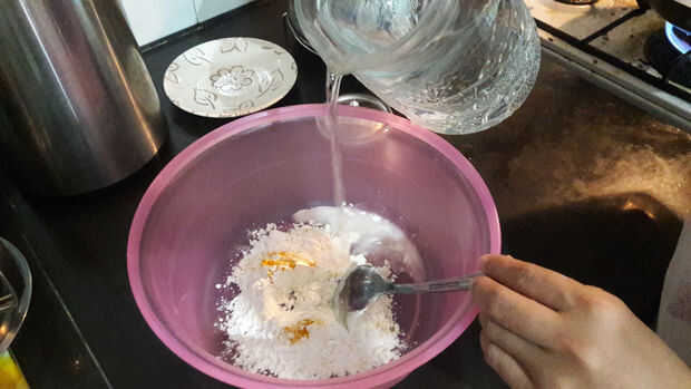 Pongo la harina de arroz, harina de trigo, polvo de la cúrcuma y una pizca de sal en un bol. Entonces, derramé el agua poco a poco mientras que mezclé la mezcla.