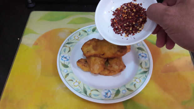 Había rociado algunas escamas del Chile encima de los plátanos fritos. Ahora, podemos comerlo.