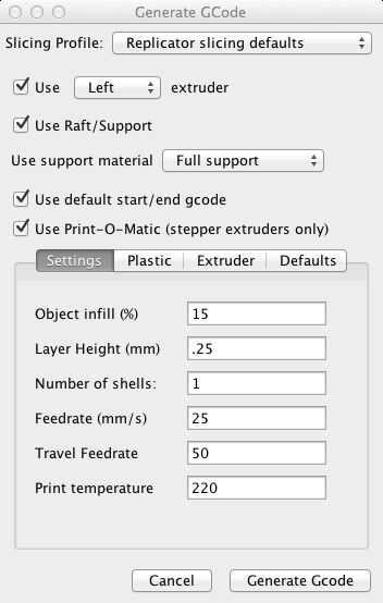 Otra cosa no incluido aquí es la temperatura de la plataforma. La temperatura arriba es para la boquilla que permite extruir el plástico, esta temperatura es para la plataforma en la que se construye el modelo. En algún lugar en la región de 115 generalmente funciona para mí. Tienes que cambiar esta configuración en el menú valores predeterminados o la gcode sí mismo, pero no es demasiado difícil (recuerda, google es tu amigo: D).