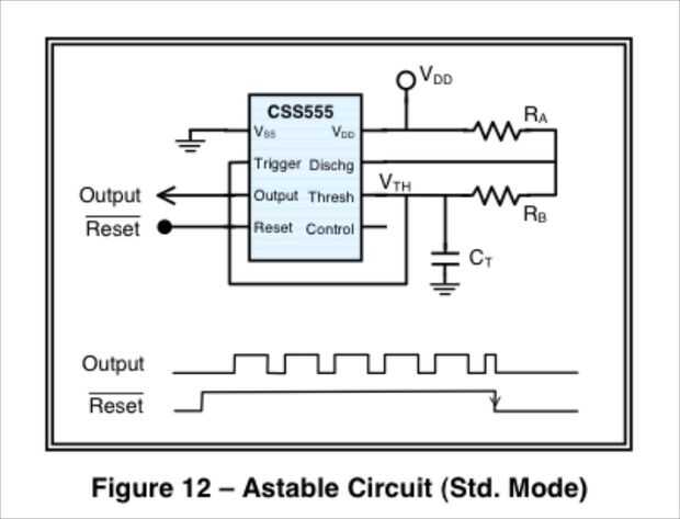El circuito básico que se utiliza aquí es la configuración de 555 astable estándar. En el inicio de un ciclo constante, el capacitor de tiempo CT empieza a cargar para arriba a través de los resistores RA y RB; el pin de descarga es abierto y el pin de salida es alto (es decir, la tensión de alimentación VDD). Cuando la tensión creciente del condensador alcanza el punto superior, que es 2/3 de la tensión de alimentación VDD, los pines de salida y descarga vaya bajo, es decir, están conectados a tierra o 0V. El voltaje del condensador cae luego vía resistor RB hasta que se alcanza el viaje un voltaje menor, 1/3VDD, lo que lleva el pasador del gatillo a la menor tensión de viaje y que causa el pin de salida para volver a alta y el pin de descarga para desconectar. Entonces el ciclo se repite como antes. Tenga en cuenta que el pin de reset debe conectarse alta para la operación; establecer bajo este pin detiene el temporizador y el pin de salida baja.