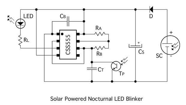 Derivación que CB no es necesaria en esta aplicación porque el gran condensador CS más se encarga de acallar cualquier problemas de voltaje que pudieran ocurrir. El diodo D bloquea CS escurra a través de la célula solar cuando está oscuro y puede ser cualquier diodo pequeño como el 1N914, 1N4148, BAT41, etc.. La resistencia RL limita la corriente a través del LED, que debe ser un tipo alto o super brillante para el flash mejor. Tenga en cuenta que en el diagrama del circuito el pin Reset se conecta directamente a la tensión de alimentación.