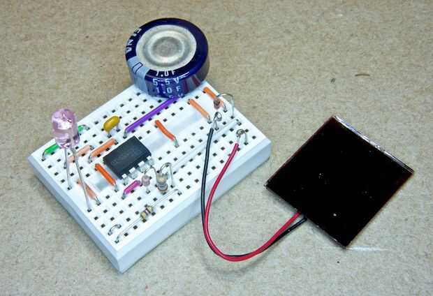 Deal Extreme - uno de ellos se muestra en la foto. Una célula con una agradable salida fuerte para esta aplicación puede sacar una linterna solar de llavero como se muestra en las dos últimas fotos. Es un poco más grande que la utilizada en el prototipo, pero quizás podría ser exprimido en un pequeño pisapapeles. Incluso puede utilizar la batería recargable de la linterna en lugar de la supercapacitor, pero la batería sólo resistirá a 1 mil o más ciclos de recarga, mientras que el condensador tiene prácticamente vida ilimitada. La tensión de salida de la célula solar para las condiciones de iluminación que se expondrá no debe exceder los 6V máximo absoluto. calificación de la viruta del CSS555 o el max. tensión nominal del condensador de almacenamiento de información que normalmente es 5.5V; el diodo de bloqueo reducirá un poco la tensión de pico de la célula. Puede insertar otro diodo o dos en serie para caer el voltaje de la celda si es necesario. Todo esto debe ser resuelto durante los ensayos de placa.