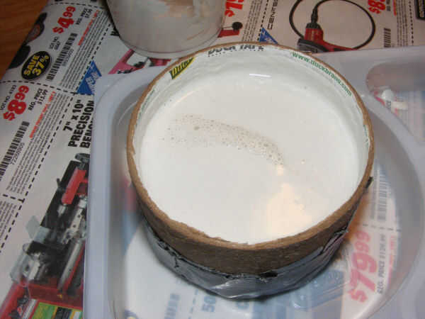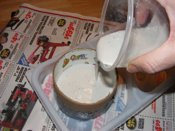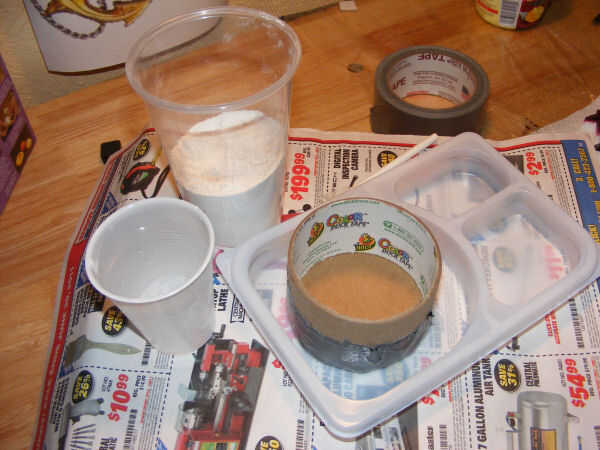 Mezcle aproximadamente 1 taza de yeso de París. Regla es 2 partes de yeso de París por 1 parte de agua. Revuelva. Vierta en el molde de la cinta de pato.