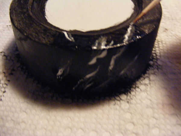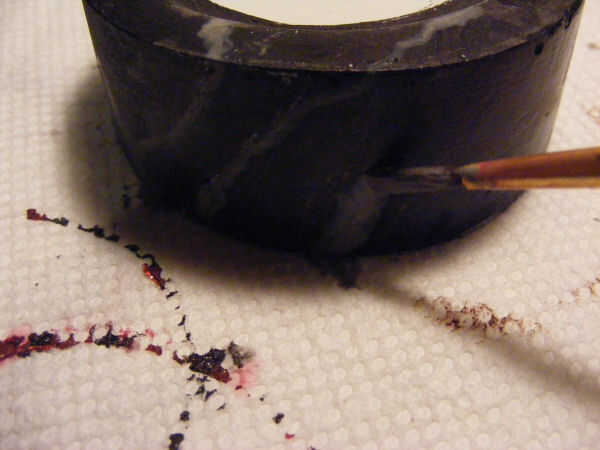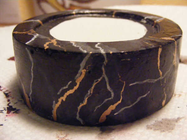 Pintura en cuartos, delgado el gris abajo con algo de agua y con un pincel de punta fina, mover unos renglones torcidos hacia arriba y sobre la parte superior de la pieza hacia el hueco.