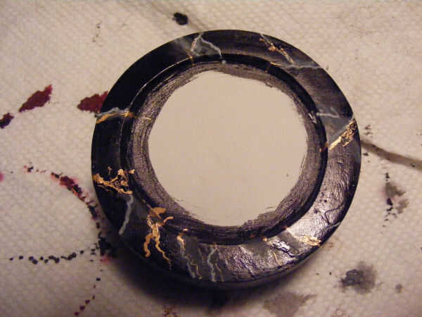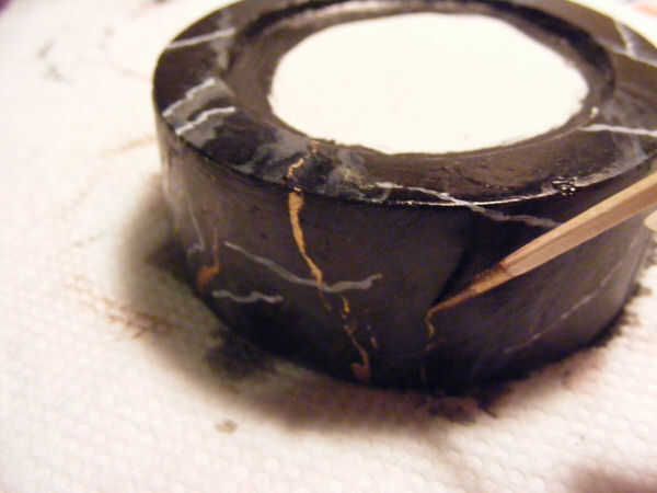 Sumerja el otro extremo de los palillos de dientes en la hoja de oro y arrastre una línea irregular de oro a lo largo de los bordes de la gris.