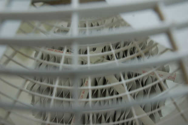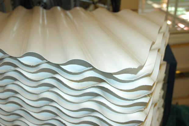 El material de relleno es la parte más crítica de conseguir que funcione bien. Utiliza 26" 96" hojas y cortar hasta cinco hojas más pequeñas de 21" por 16,25". Estas pequeñas hojas se cortan en diagonal de los corrugaciones (ver foto). Las hojas son apiladas con hojas alternando sus corrugaciones.