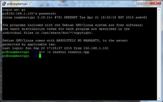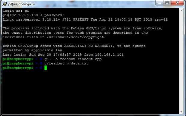 Una vez que el ADC se ha conectado y se ha cargado el módulo del kernel, datos pueden leerse desde el ADC al conectar con el archivo de dispositivo asociado con el módulo del kernel. Para conectar con el módulo del núcleo, se necesita otro programa. Este programa puede escribirse en varios lenguajes de programación diferentes. Para este artículo, fue elegido C++. Crear un nuevo archivo denominado readout.cpp y agregar el siguiente código o sube readout.cpp abajo.