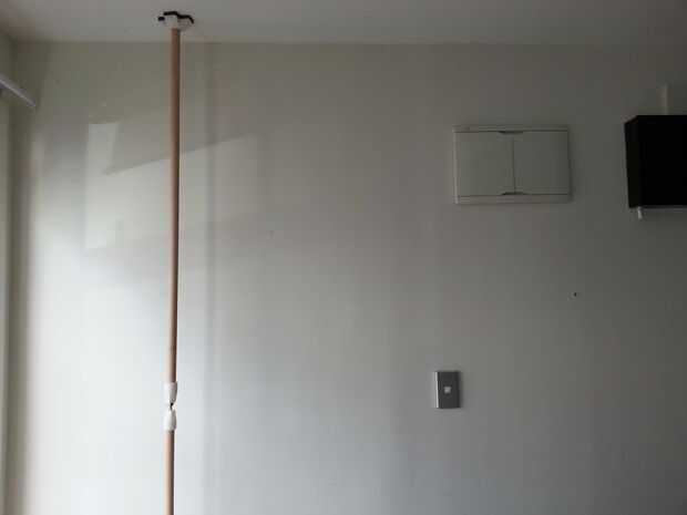 Llevar el piso a techo abrazadera vertical en la posición de elección poniendo el un pie abajo en el piso y girar hacia arriba. Debe ser capaz de ir vertical sin tocar el techo todavía, si no tuya y es demasiado larga, no te preocupes solo cortadas un poco de uno de los extremos.