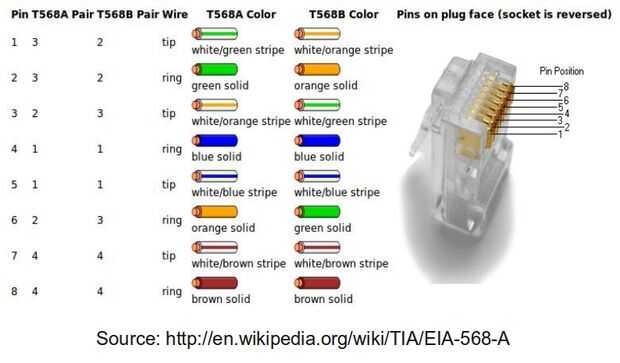 Para hacer un cable cruzado simplemente mezcle los cabos. Una conexión es T568A-estilo y los otros T568B.