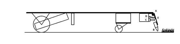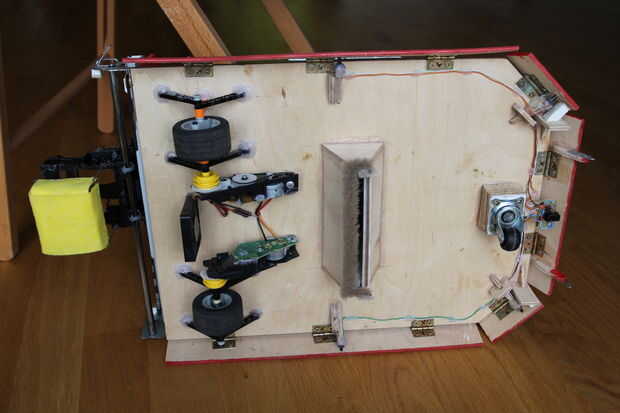 Robot se detiene y vaya hacia atrás cuando detecta alfombra gruesa que pueda causar obstrucción del robot o quemar los motores. El principio es muy simple: es un pedazo de alambre doblado (B) conectado a la placa de tope (E). Después de mudarse a la alfombra alambre presiona el tope montado en las bisagras (A) que presiona el botón (C). En todos los topes he utilizado resorte adicional (D) que provoca el tope en su posición anterior.