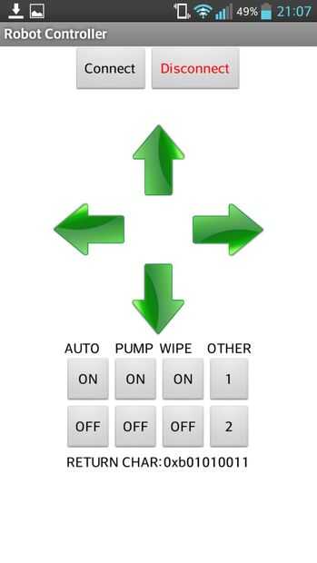 Aplicación en smatphone funciona de la siguiente manera: cuando usted pulsa el botón smartphone enviar un byte de información (un char) recibido por el microcontrolador. El microcontrolador también devuelve el mismo byte al smartphone para comprobar errores de transmisión. Es posible: conectar y desconectar el robot, control manual, activar y desactivar: auto modo, mop activa, soplador.