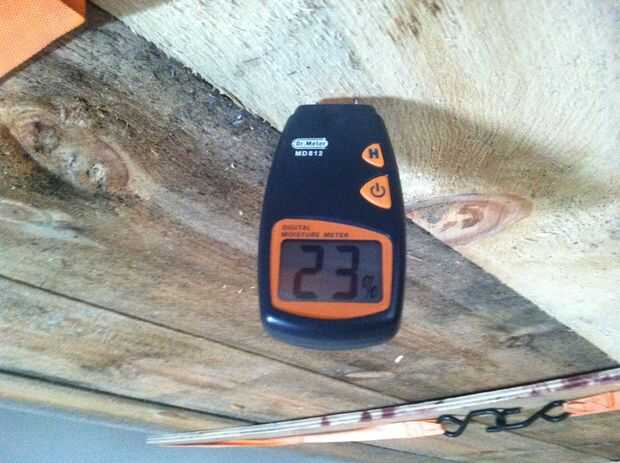 La madera estaba cubierto con una lona y tenía un pie de nieve y hielo por encima, pero hurgamos y cavamos y la excavamos y la cargamos en el remolque. A continuación, apilamos los tablones, con palos entre las capas, en el sótano para se aclimataran antes de la molienda. Usando un medidor de humedad comprado de Amazon, comprobamos al azar unos tablones para tener una idea del estado de la madera.