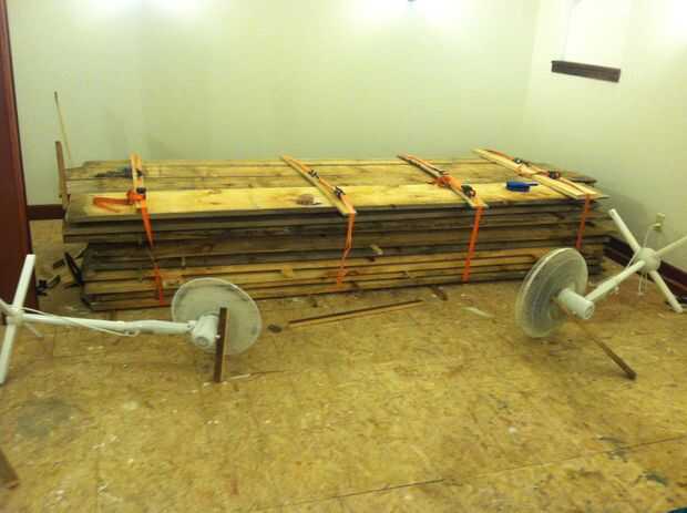 La humedad variaba entre 15-25%, lo me tenía preocupado. Así para prevenir los tablones se torcieran o desformaran los sujetamos con unos correas con carracas. Montamos unos ventiladores frente a la pila y interés en otros proyectos durante las próximas 2 semanas.