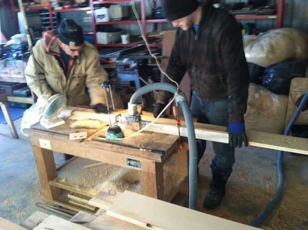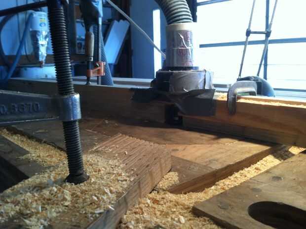 Después de tener todas las tablas Co-Pastora de tablones aserrados en bruto a tablas lisas y cuadrados, era hora de configurar el taller para hacer el machihembrado. Usando una herramienta rotativa de 1/2 de pulgada y una mesa de multi-herramienta (mi padre hizo en los 80 siguiendo un proyecto de La Mecánica Popular), era momento de manejar las tablas unas cuantas veces más. Una razón más para usar un grosor de 3/4 de pulgadas para el piso era la broca de la herramienta rotativa fue hecho por grosores de este tamaño, era el destino.