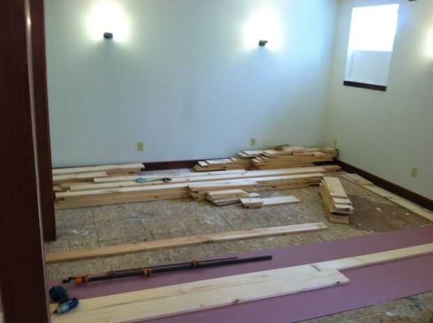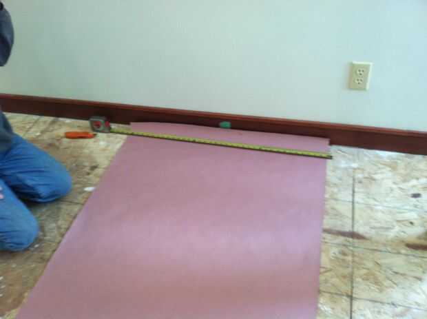 El subpiso (es decir, el fondo yace bajo tablas de las) fue instalado hace unos años, y solo tuvimos añadirle unos tornillos y aspirarlo. Un rollo de papel para cubrir pisos de color de rojo fue comprado y lo pies de la de 3 extendimos por el piso en secciones, sujetándolas con grapas. Comprobamos las tablas por última vez con el medidor de humedad todas tenían un nivel de humedad menos de 10%, leí fue un buen punto de partida para un piso de madera.