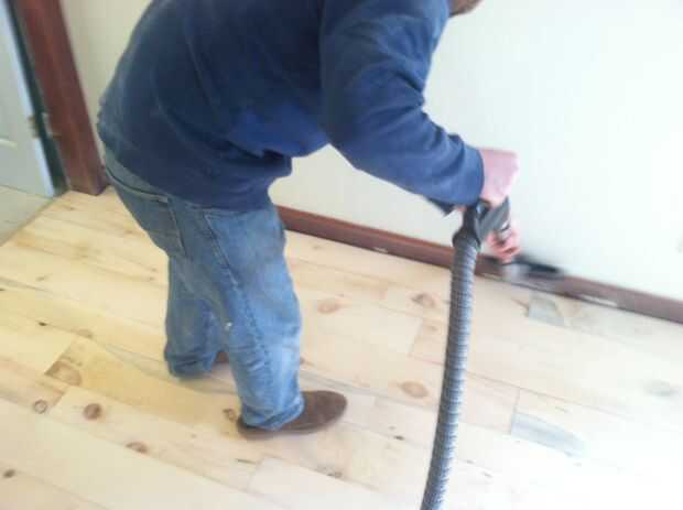 Usando papel de lija de grano 120, una máscara para el polvo, y una lijadora orbital lijamos todo el piso. Sobre todo para eliminar las partes asumir y cualesquier marcas causadas por la cepilladora. La madera blanda se lija muy rápido y después de usar la lija de grano 120 sobre todo el piso, lo lijamos con lija de grado 180 para prepararlo para el acabado.