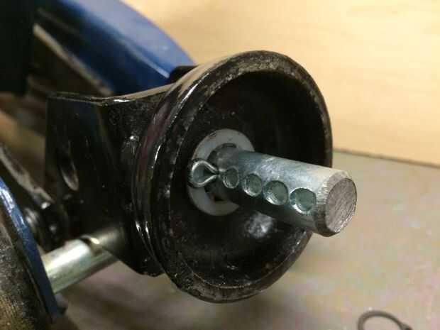 Compré un pasador de 1/2 pulgada de diámetro con múltiples orificios taladrados previamente en que vuelva a colocar el pasador corto que iba originalmente a través de las dos piezas circulares. Le puse una arandela de nylon debajo de la cabeza de la clavija de enganche y uno donde pasa a través de la pieza circular, una chaveta tiene estas en el lugar. No hay ninguna carga sobre el eje así una chaveta es adecuada.