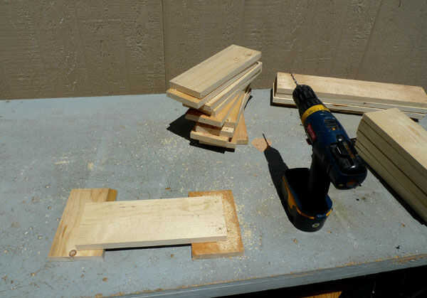 Agujeros lo suficientemente anchos como para dejar un tornillo pase a través fácilmente en los extremos de dos de las tablas para cada bandeja.