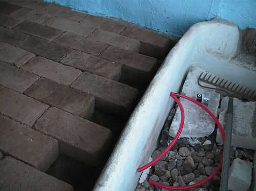Una vez que tienes todos los ladrillos puestos, puede llenar el perímetro, entre los ladrillos y las paredes, de hormigón. Esto no utiliza mucho hormigón y puede hacerse en media hora. La arena de la pantalla y luego llana el hormigón liso y nivelado con la parte superior de los ladrillos.