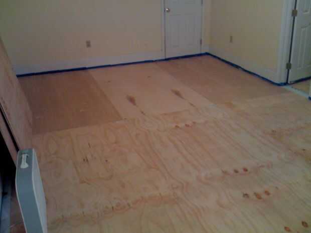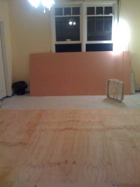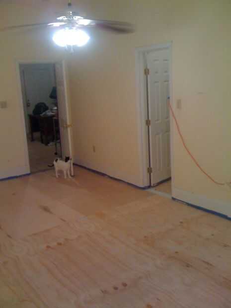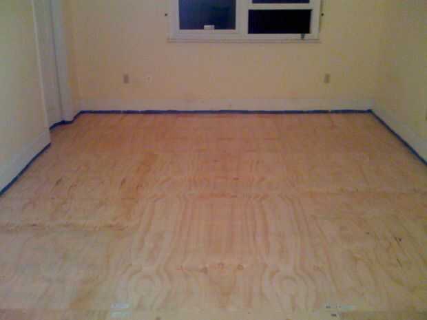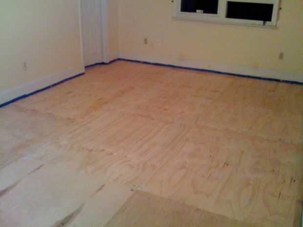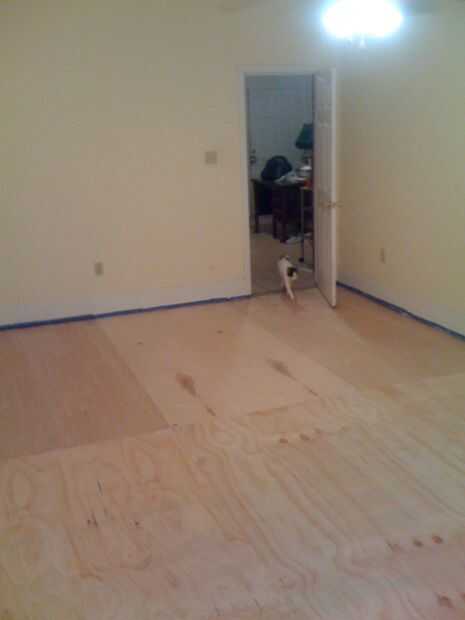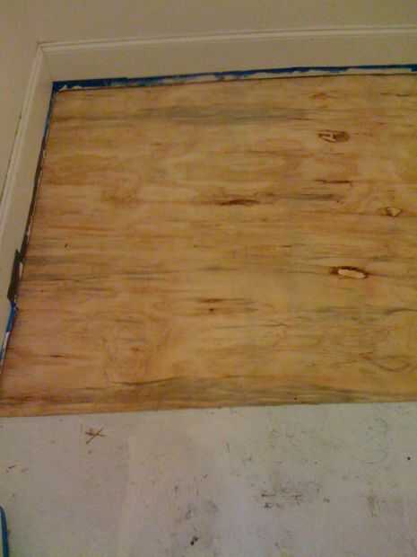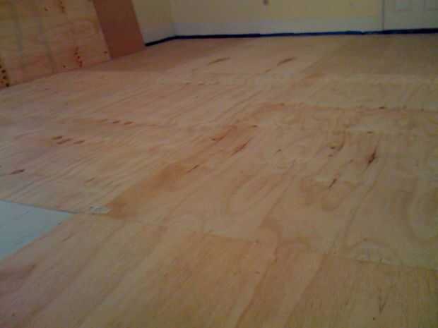 Utilice el adhesivo de construcción en el liberalmente en el lado "malo" de la madera contrachapada (el lado sin la viruta agradable). Una vez pegada la madera contrachapada en el contrapiso y clavo hacia abajo. He utilizado un montón de clavos como quería que fijarse sólidamente y no quiero tener que esperar a que el pegamento se seque para colocar más hojas.