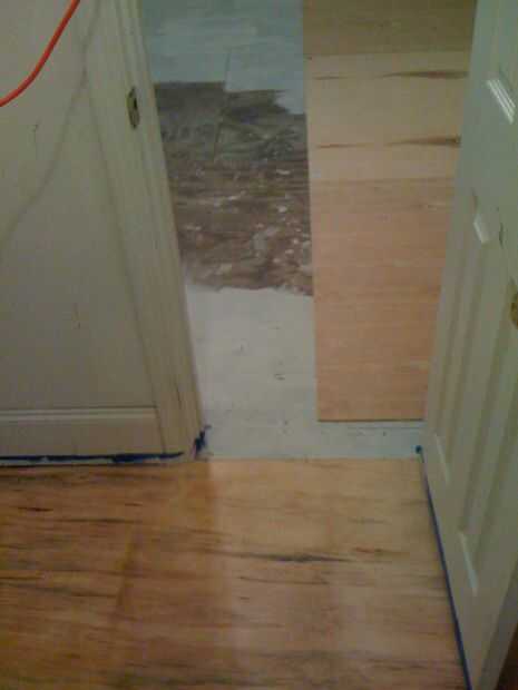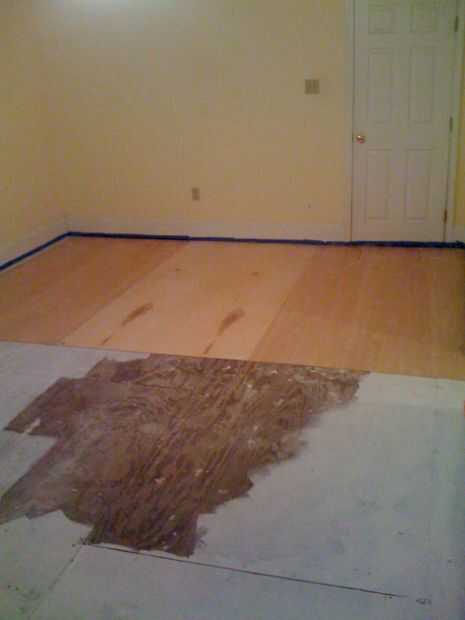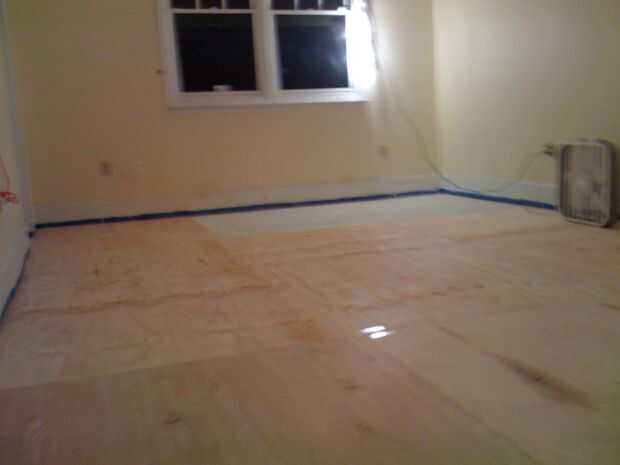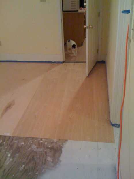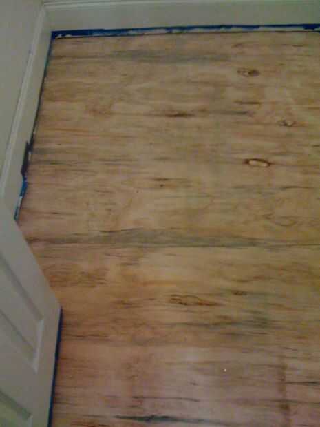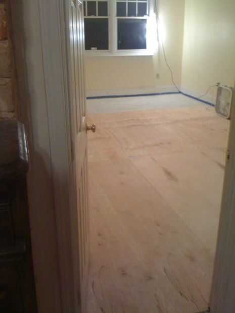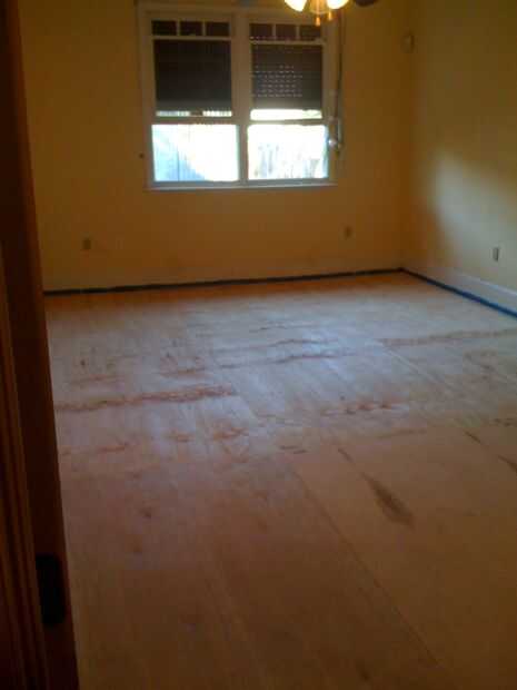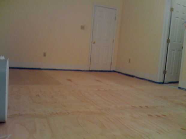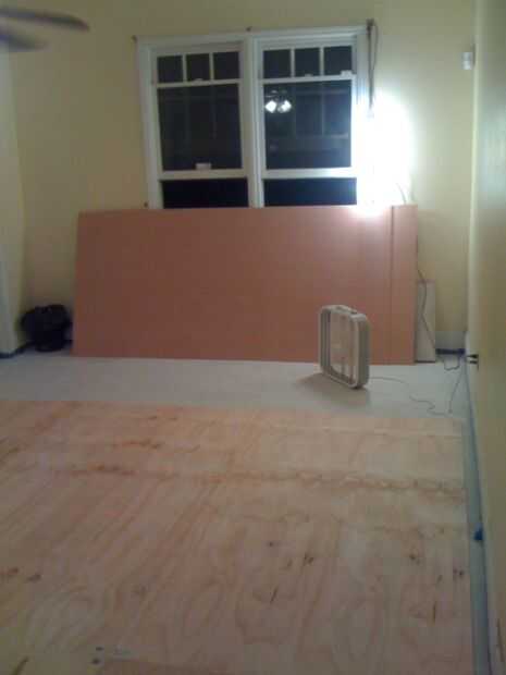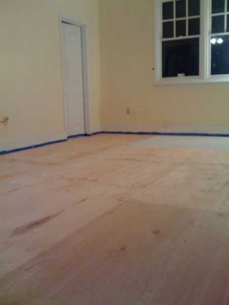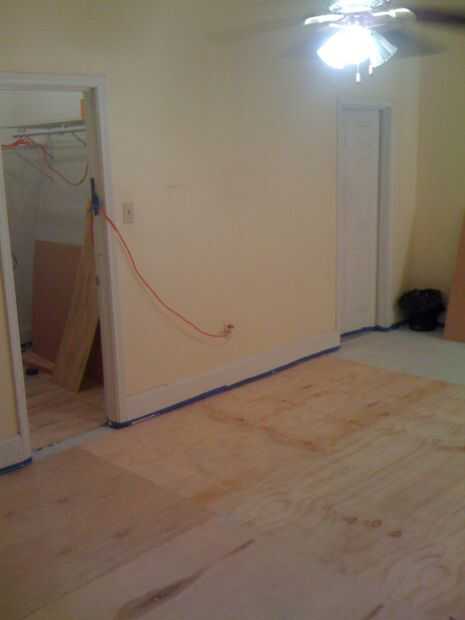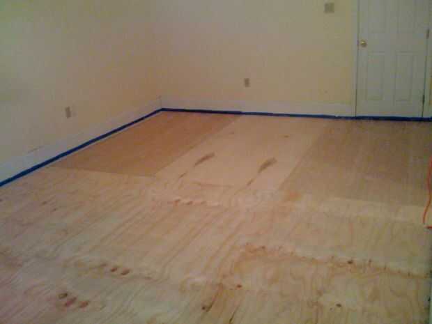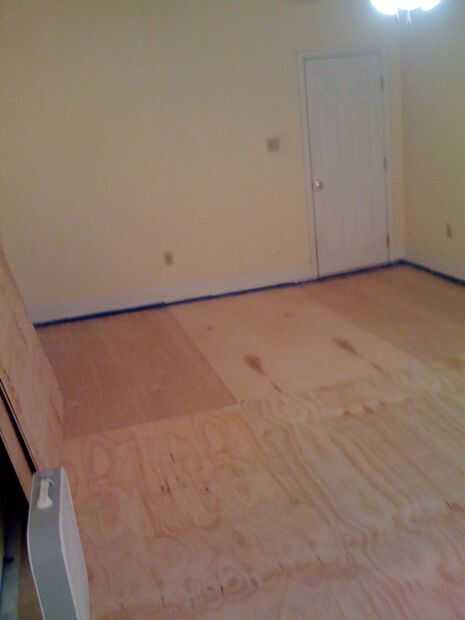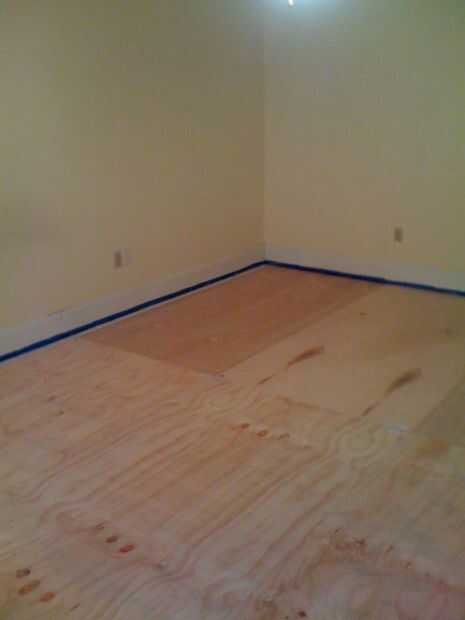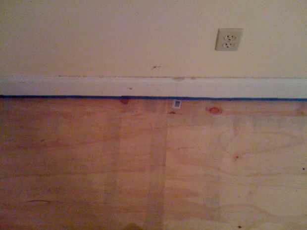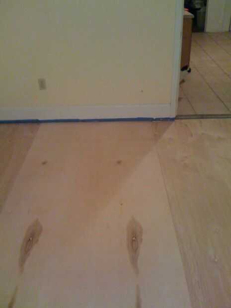 Pongo abajo la madera en hojas ejecutando longwise cerca unos de otros. Había una pequeña franja en un lado de una pared que me cortar tiras de la madera contrachapada (sobre 4 en"amplia paradas de 8').