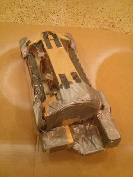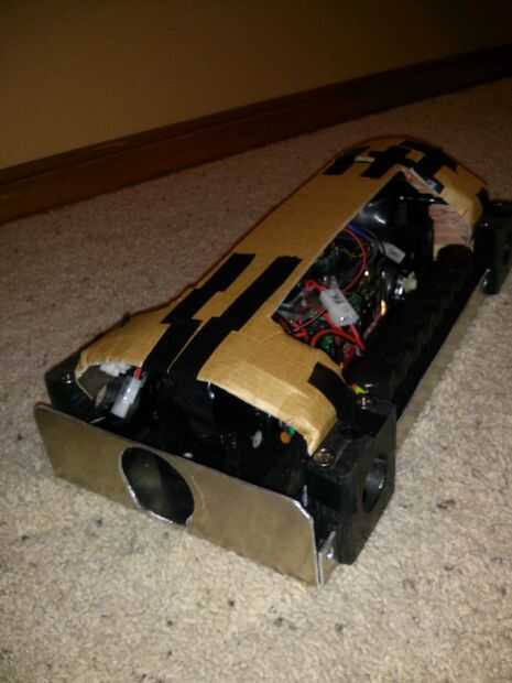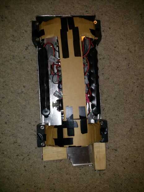 Ahora tengo que proteger a todos ésos electrónica agradable. Así que construí una máquina de vacío de forma que presentaré un Instructable nuevo después de que uno. Me quité las pistas para este paso ya no son necesarios en el proceso. Pero básicamente lo que hice fue primero tomé la cartulina y pegadas sobre cualquier electrónica o piñones que no quería que el cuerpo para poner en (da espacio), entonces tomé más cartón y grabado hacia abajo para facilitar algunos más suaves esquinas cuando que moldearla. También he añadido a algunos espaciadores de madera que serán muy útiles más adelante para la garra y la cámara.