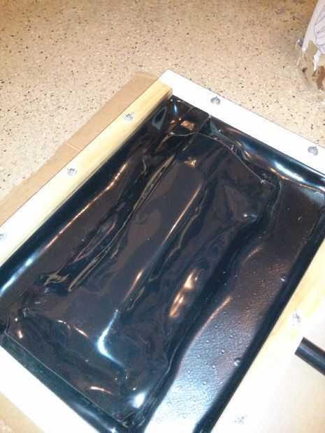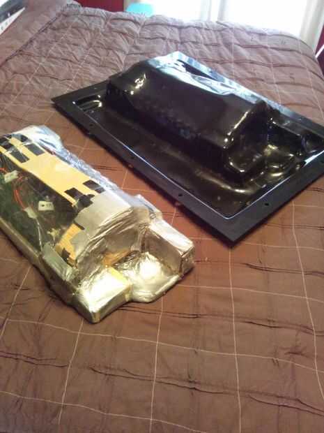 Luego pongo el robot todo en una bolsa de sello de vacío (uno de los grandes que use una aspiradora para succionar hacia abajo). Esto creó un un robot completamente sellado y tenía bordes lisos sobre todo. Luego grabó back todos de las aletas y bolsa extra de material. Luego usar 1/8" espesor lámina de plástico ABS y mi vacío anterior para hacer el molde superior como se puede ver.