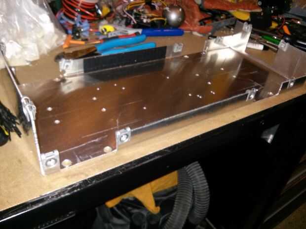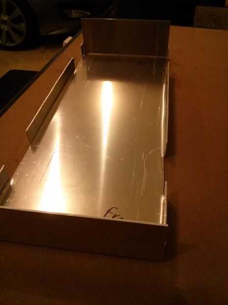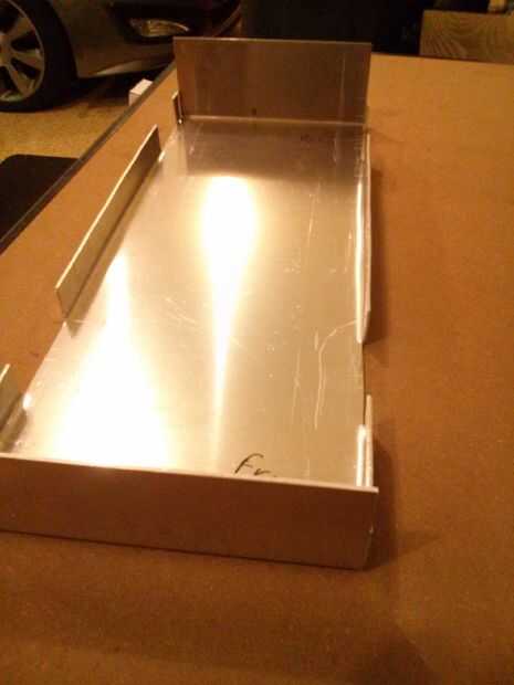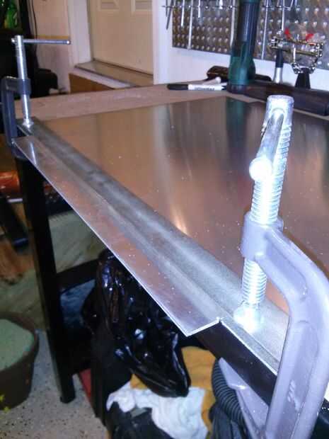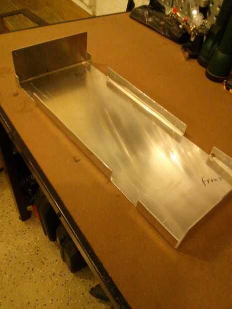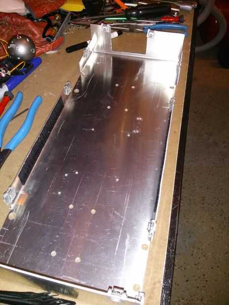 Me sujeta la hoja a la mesa de trabajo y utiliza un mazo de goma para inclinarse el reborde en ángulo de 90 grados. También usé unos alicates para doblar y enderezar los lados ondulados de la maza. Idealmente sería utilizar una dobladora de chapa para esto pero no tengo uno así que tuve que improvisar. Luego perforé todos los agujeros por todo el hardware y los componentes que necesitan ser instalado. También he puesto Velcro en los laterales que los paquetes de la batería en más tarde.