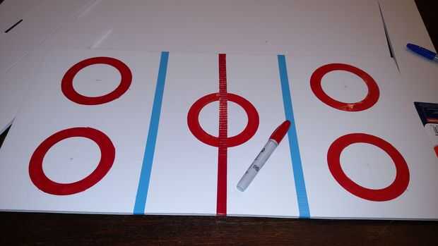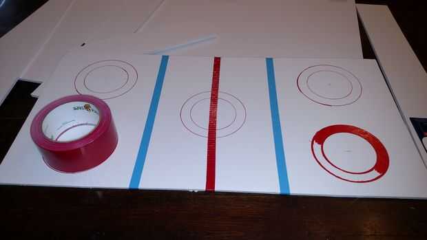 Después de medir para localizar los centros de la cara de los círculos, utilizar un rollo de cinta adhesiva para crear las líneas internas y externas de cada círculo. Luego colorearlas con un marcador Sharpie rojo.
