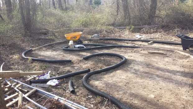 Aproximadamente extienda su pipa del drenaje y 4 x 4 en las esquinas. De la estaca hacia abajo el tubo y madera como vas. Te recomiendo por lo menos un pie de varilla para cada juego. También dependiendo del tamaño del coche y cómo muchos coches que desea correr. Recomiendo por lo menos 5 pies de ancho en la pista. Esto me pareció un buen tamaño para 1/16 escala y unos coches de carreras. Mis vueltas en bancos son sólo dos y altura de tres 4 x 4 pero que depende de usted.